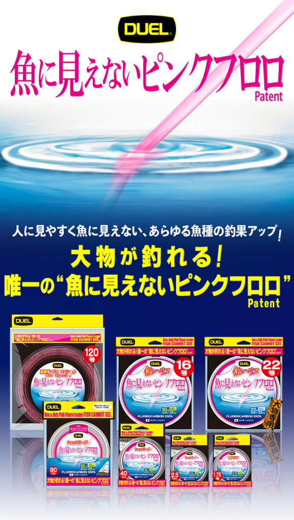 最近は、株式会社デュエルさんの魚に見えないピンクフロロがお気に入りです。以前は魚に警戒心を抱かせないよう細いリーダーを使ってましたが、このリーダーのおかげで号数の大きいものでも使えるようになりました。ある程度号数を大きくしても魚の食い気は変わらないし、細いリーダーでは無理だった大きな魚にも対応できるようになったのでうれしい限りです(*^^*)技術の進歩はすごいなぁとあらためて思いますね。